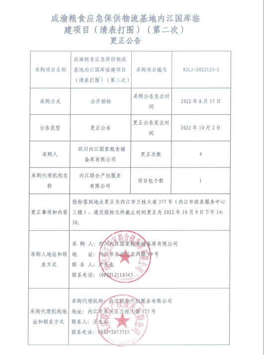 成渝粮食应急保供物流基地内江国库临建项目(清表打围)(第二次) 更正公告
