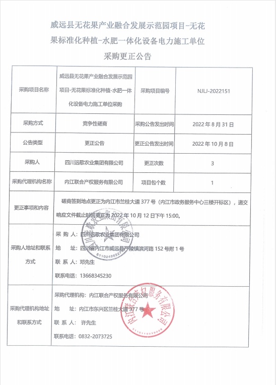威远县无花果产业融合发展示范园项目-无花果标准化种植-水肥一体化设备电力施工单位采购更正公告