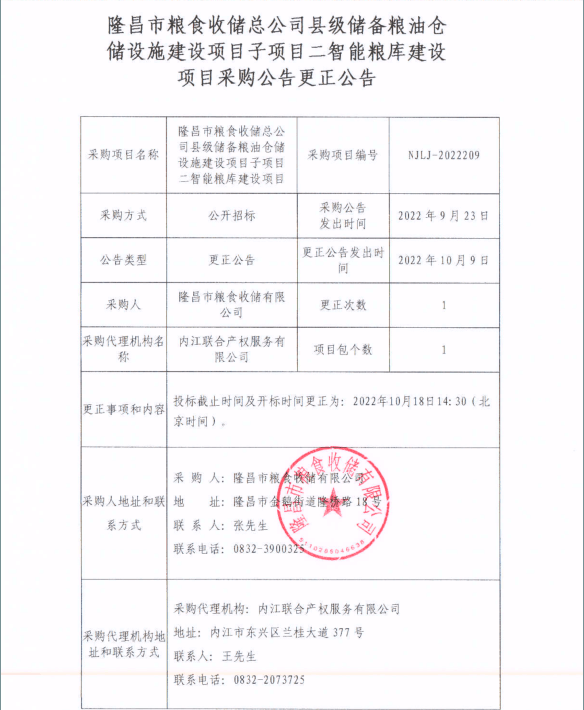 隆昌市粮食收储总公司县级储备粮油仓储设施建设项目子项目二智能粮库建设项目采购公告更正公告