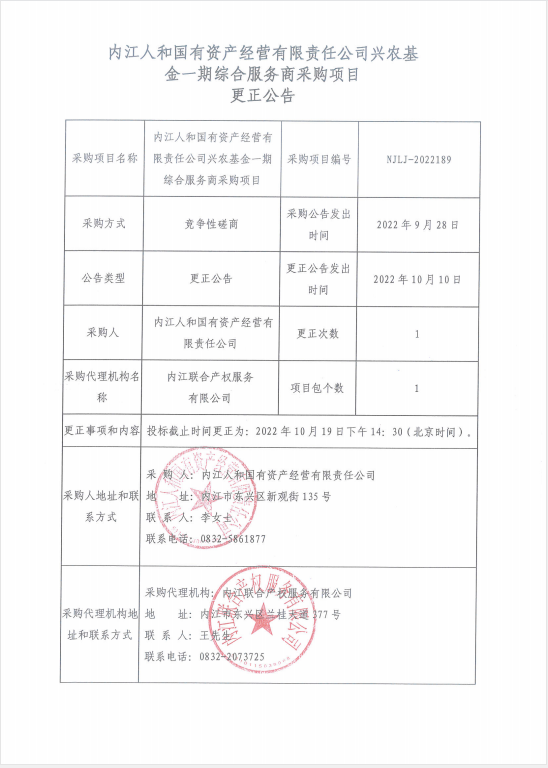 内江人和国有资产经营有限责任公司兴农基金一期综合服务商采购项目采购公告更正公告
