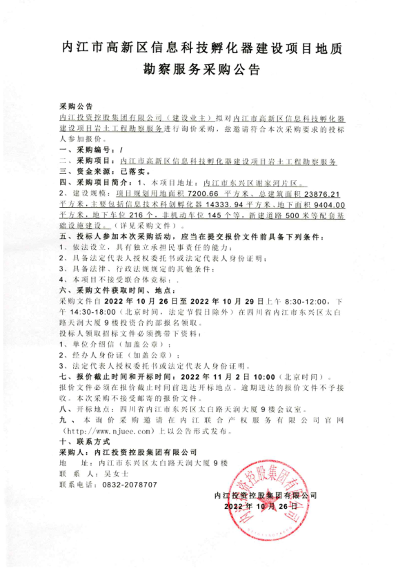 内江市高新区信息科技孵化器建设项目地质勘察服务采购公告