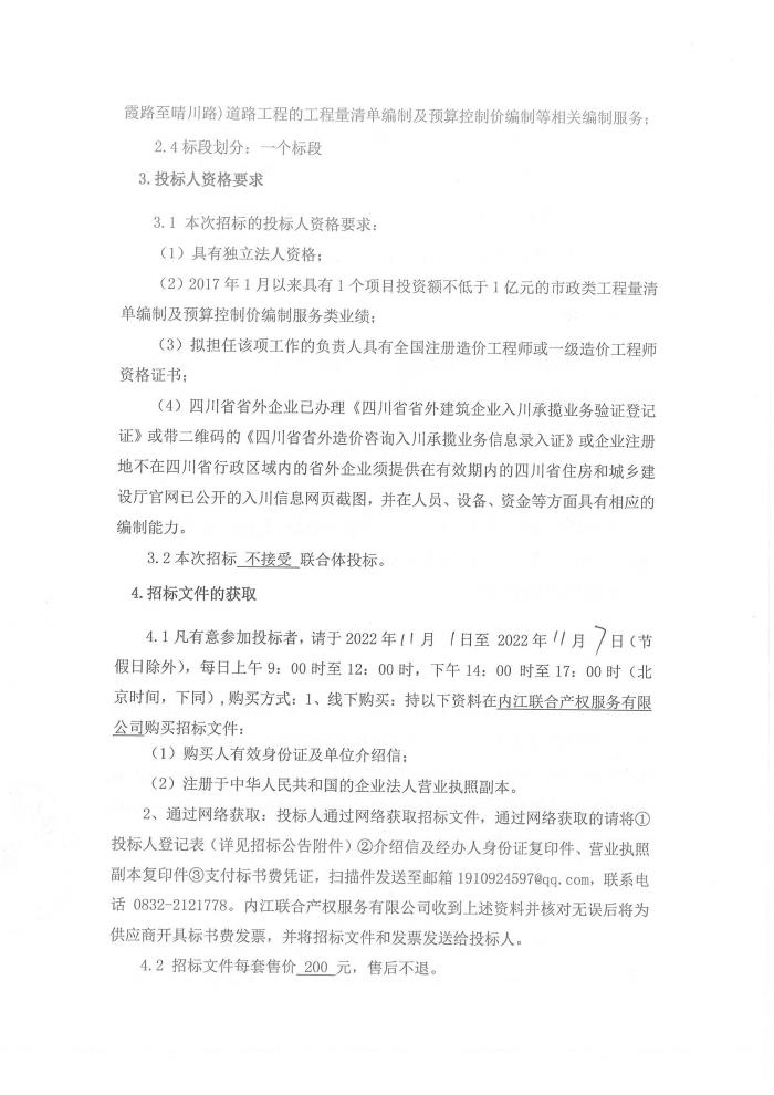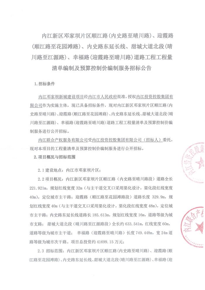 内江新区邓家坝片区顺江路(内史路至晴川路)、迎霞路(顺江路至花园滩路)、内史路东延长线、甜城大道北段(晴川路至江源路)、幸福路(迎霞路至晴川路)道路工程项目工程量清单编制及预算控制价编制服务招标公告