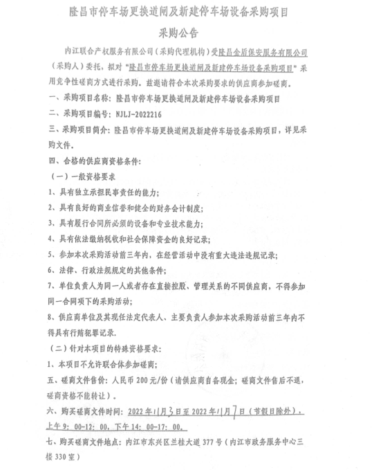 隆昌市停车场更换道闸及新建停车场设备采购项目采购公告