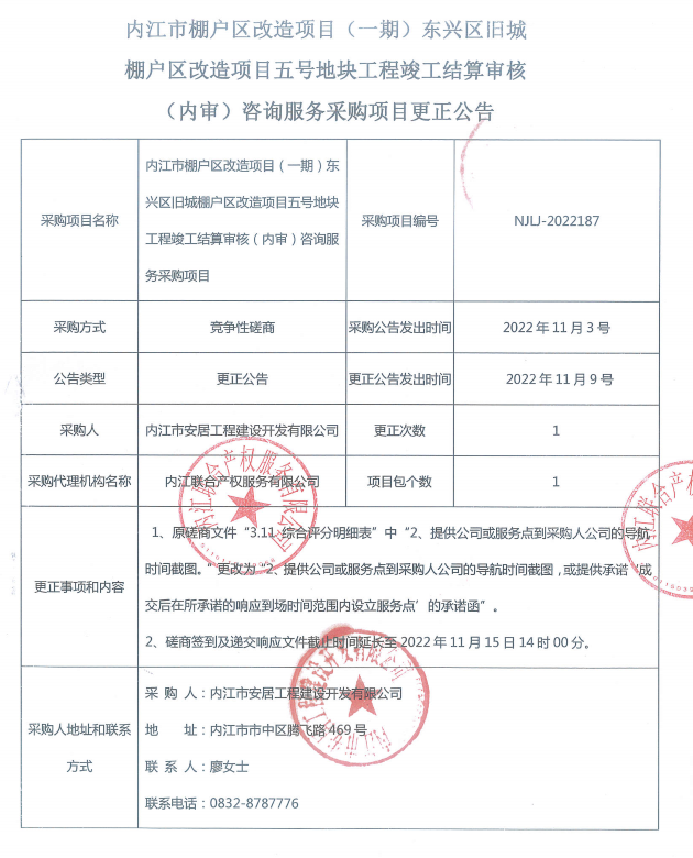 内江市棚户区改造项目(一期)东兴区旧城棚户区改造项目五号地块工程竣工结算审核(内审)咨询服务采购项目更正公告