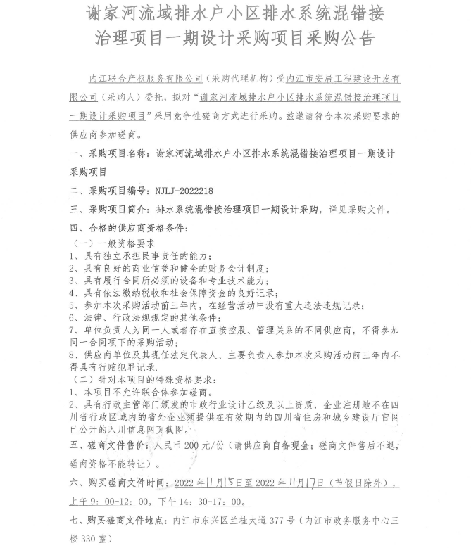 谢家河流域排水户小区排水系统混错接治理项目一期设计采购项目采购公告