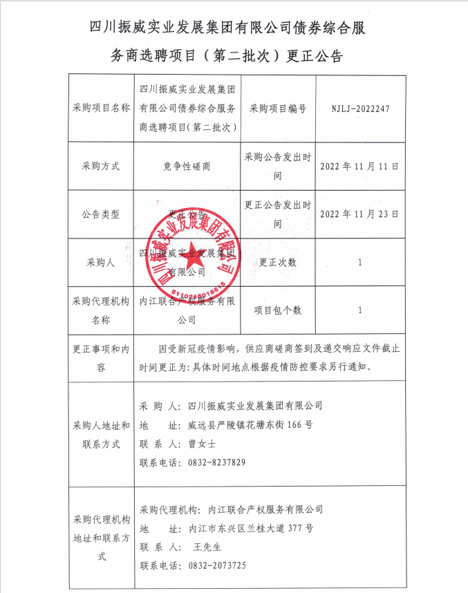 四川振威实业发展集团有限公司债券综合服务商选聘项目(第二批次)更正公告