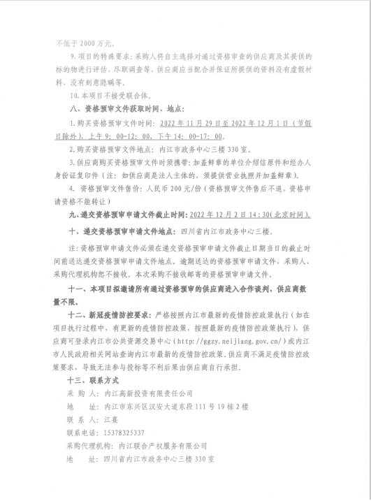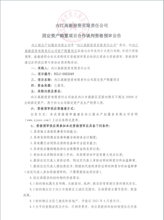 内江高新投资有限责任公司固定资产购置项目合作谈判资格预审公告