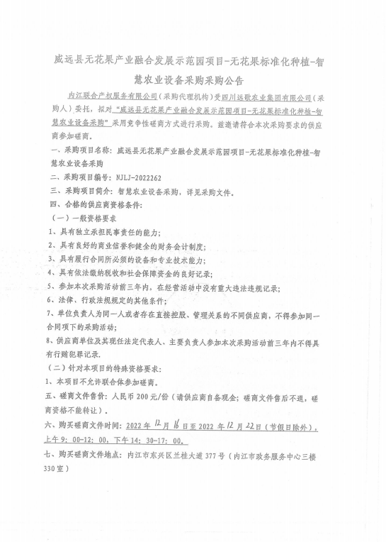 威远县无花果产业融合发展示范园项目发展资金-无花果标准化种植-智慧农业设备采购采购公告