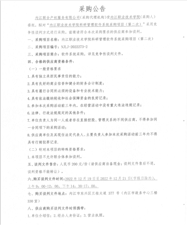 内江职业技术学院科研管理软件系统采购项目(第二次)采购公告