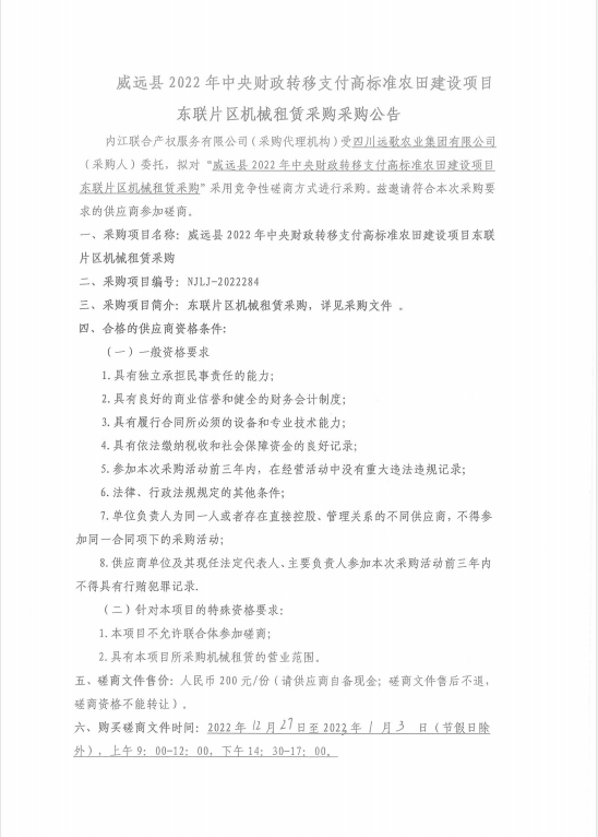 威远县2022年中央财政转移支付高标准农田建设项目东联片区机械租赁采购采购公告