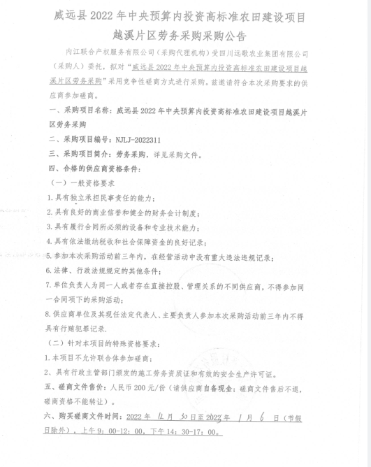 威远县2022年中央预算内投资高标准农田建设项目越溪片区劳务采购采购公告