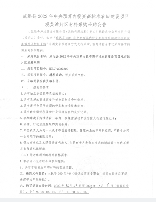 威远县2022年中央预算内投资高标准农田建设项目观英滩片区材料采购采购公告