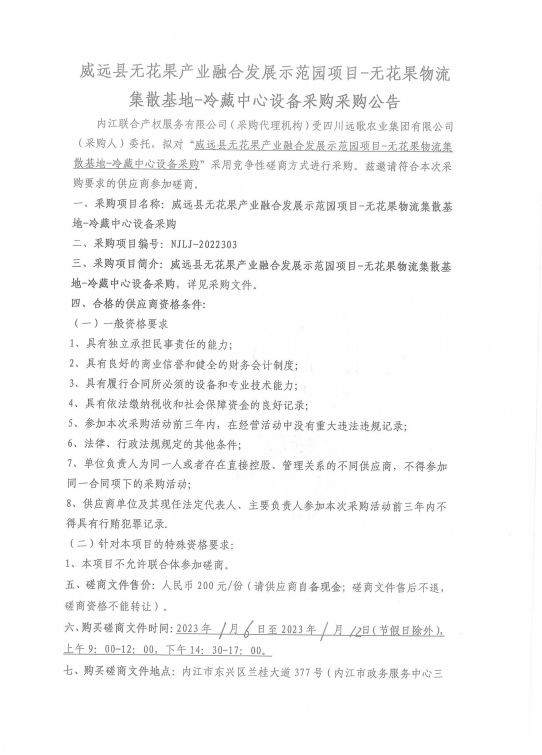 威远县无花果产业融合发展示范园项目-无花果物流集散基地-冷藏中心设备采购采购公告
