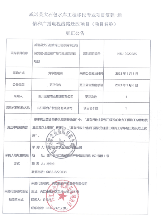 威远县大石包水库工程移民专业项目复建-通信和广播电视线路迁改项目更正公告