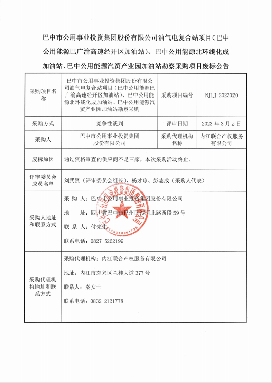巴中市公用事业投资集团股份有限公司油气电复合站项目(巴中公用能源巴广渝高速经开区加油站)、巴中公用能源北环线化成加油站、巴中公用能源汽贸产业园加油站勘察采购废标公告