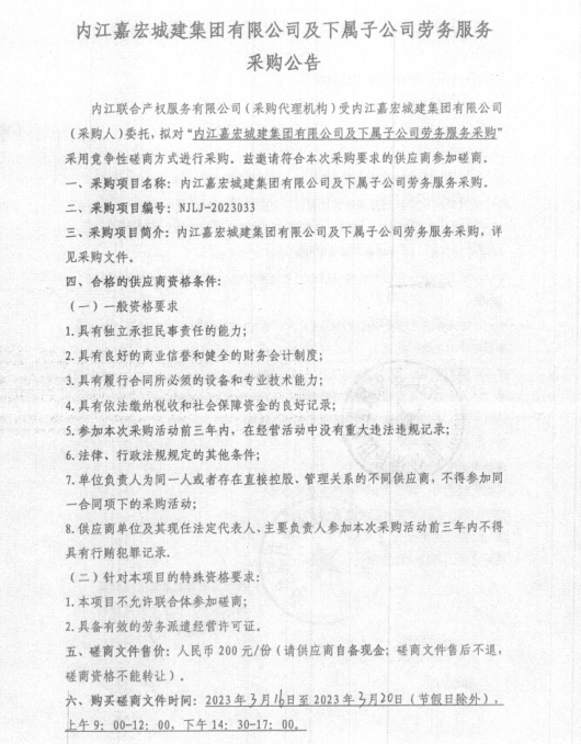 内江嘉宏城建集团有限公司及下属子公司劳务服务采购公告