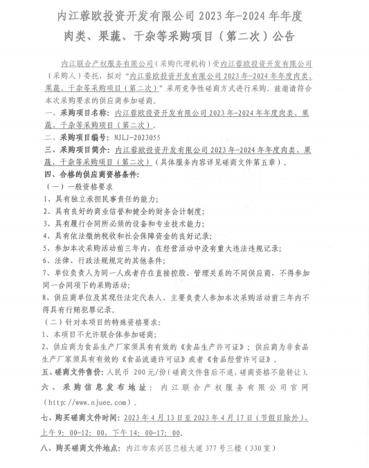 内江蓉欧投资开发有限公司2023年-2024年年度肉类、果蔬、干杂等采购项目(第二次)采购公告