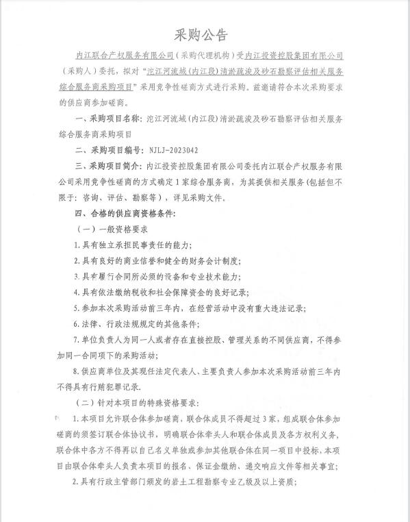 沱江河流域(内江段)清淤疏浚及砂石勘察评估相关服务综合服务商采购项目采购公告