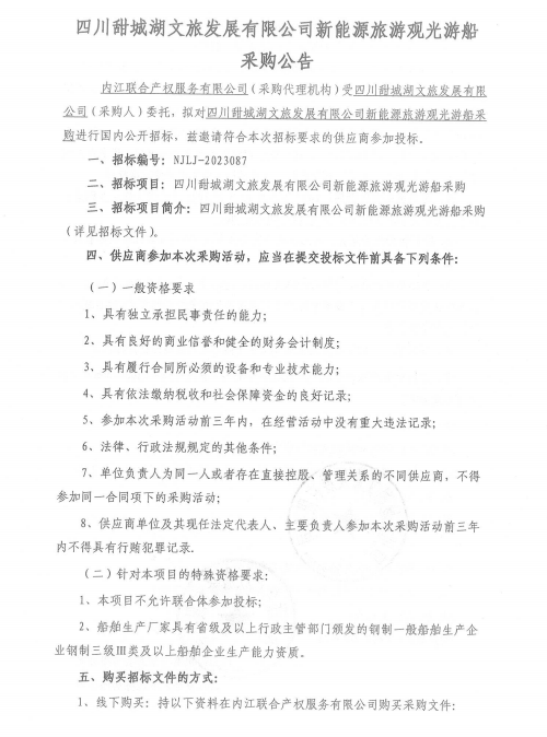 四川甜城湖文旅发展有限公司新能源旅游观光游船采购公告
