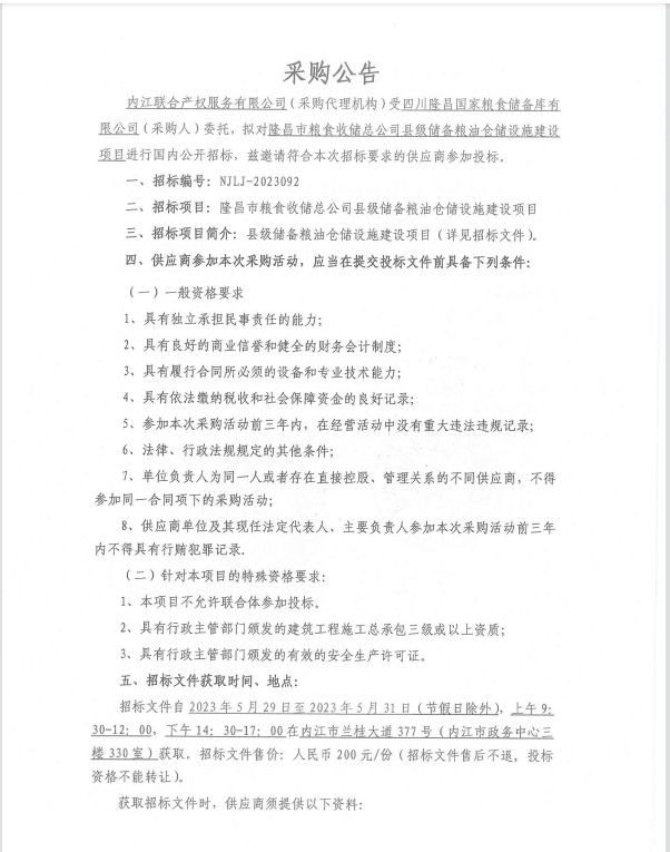 隆昌市粮食收储总公司县级储备粮油仓储设施建设项目(第二次)采购公告