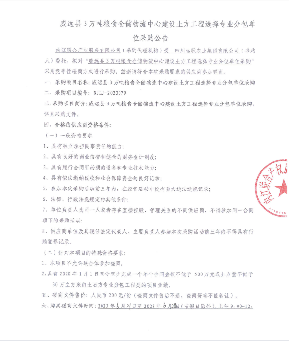 威远县3万吨粮食仓储物流中心建设土方工程选择专业分包单位采购公告