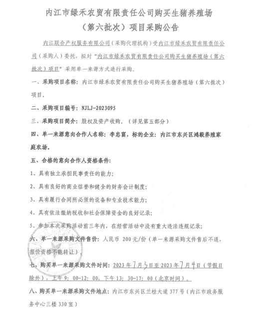 内江市绿禾农贸有限责任公司购买生猪养殖场(第七批次)项目采购公告