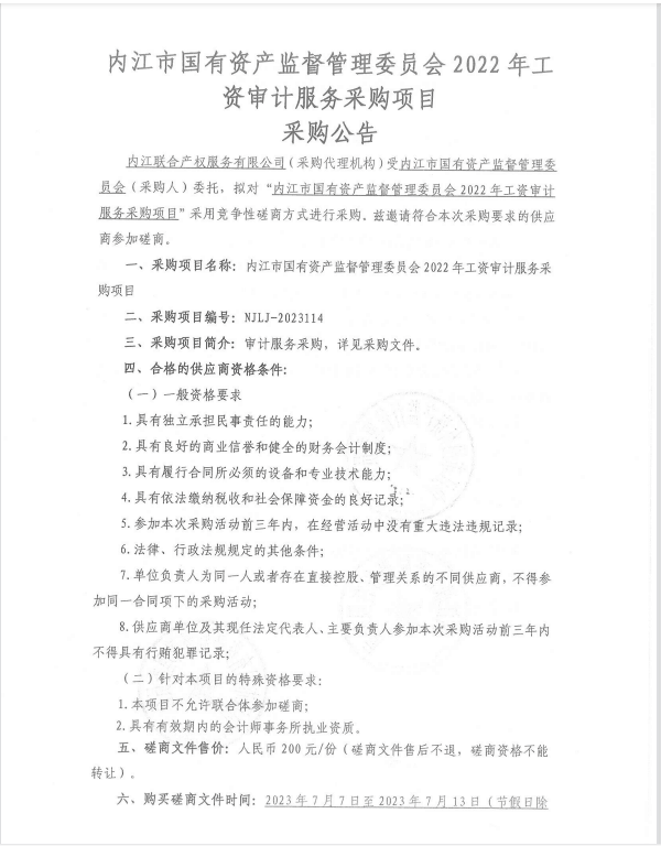 内江市国有资产监督管理委员会2022年工资审计服务采购项目采购公告