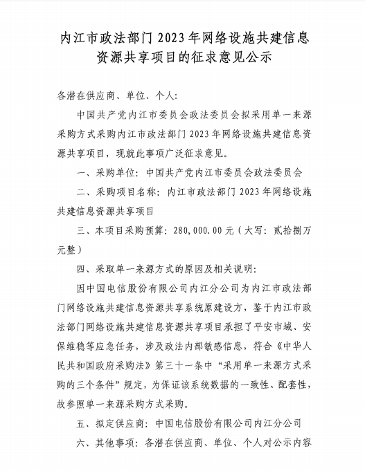 内江市政法部门2023年网络设施共建信息资源共享项目的征求意见公示