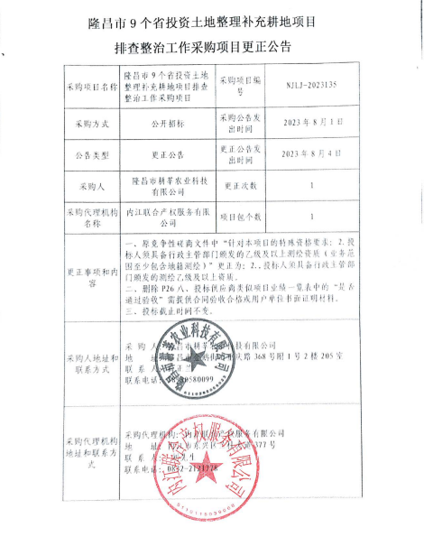 隆昌市9个省投资土地整理补充耕地项目排查整治工作采购项目更正公告