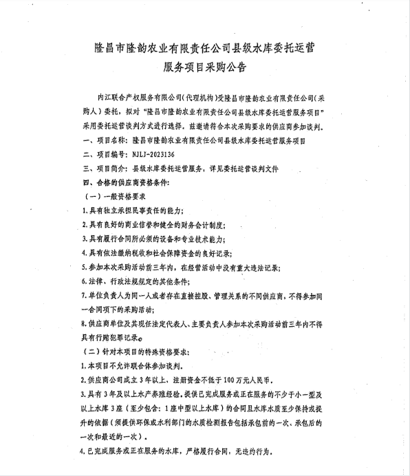 隆昌市隆韵农业有限责任公司县级水库委托运营服务项目采购公告