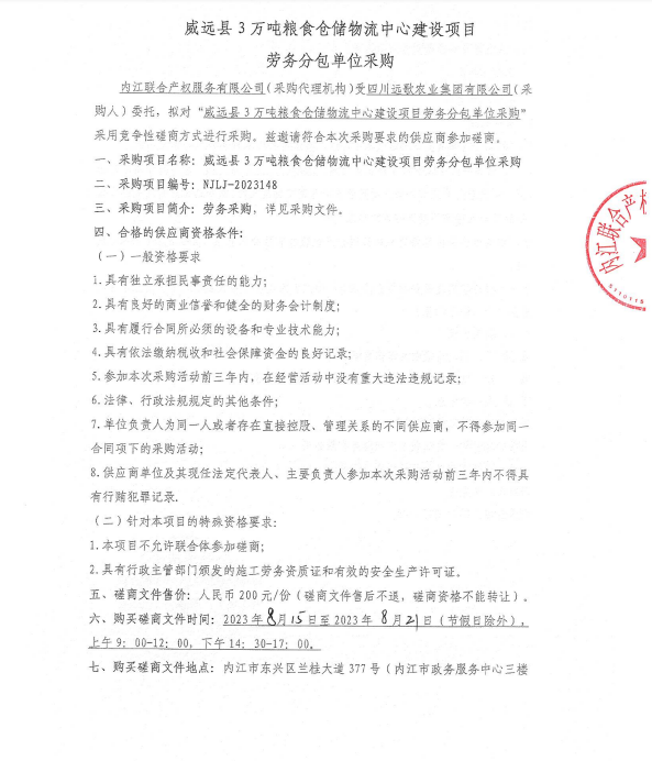 威远县3万吨粮食仓储物流中心建设项目劳务分包单位采购公告