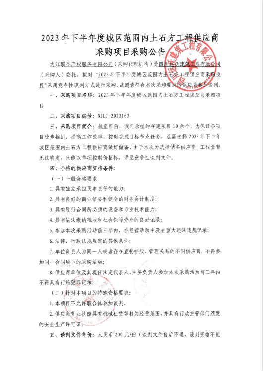 2023年下半年度城区范围内土石方工程供应商采购项目采购公告