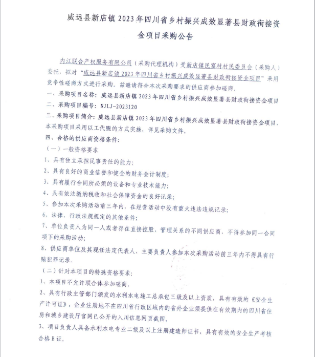 威远县新店镇2023年四川省乡村振兴成效显著县财政衔接资金项目采购公告
