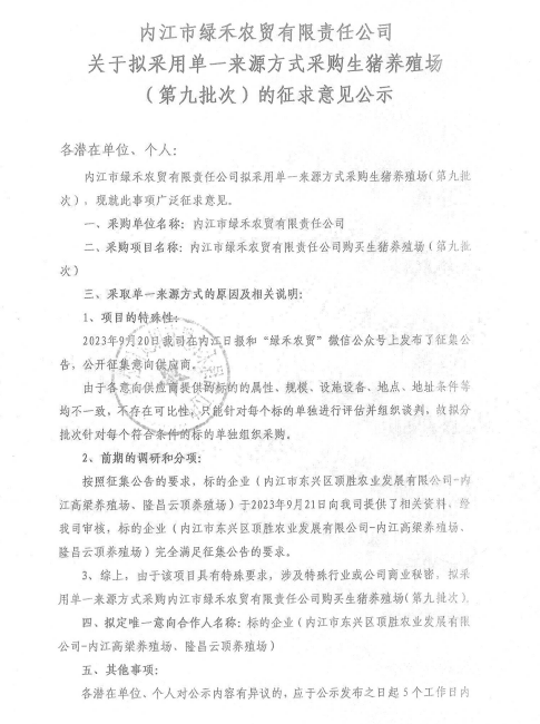 内江市绿禾农贸有限责任公司购买生猪养殖场 (第八批次)项目采购公告