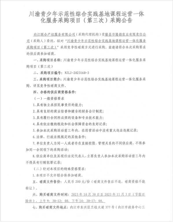 川渝青少年示范性综合实践基地课程运营一体化服务采购项目(第三次)采购公告