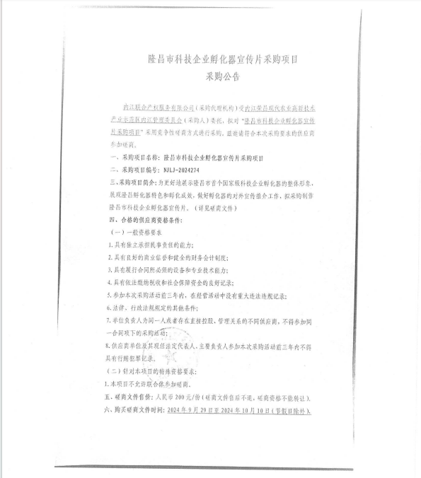 隆昌市科技企业孵化器宣传片采购项目采购公告