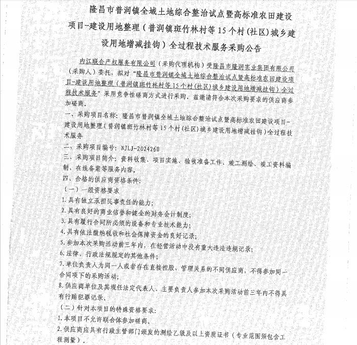 隆昌市普润镇全域土地综合整治试点暨高标准农田建设项目-建设用地整理(普润镇斑竹林村等15个村(社区)城乡建设用地增减挂钩)全过程技术服务采购公告