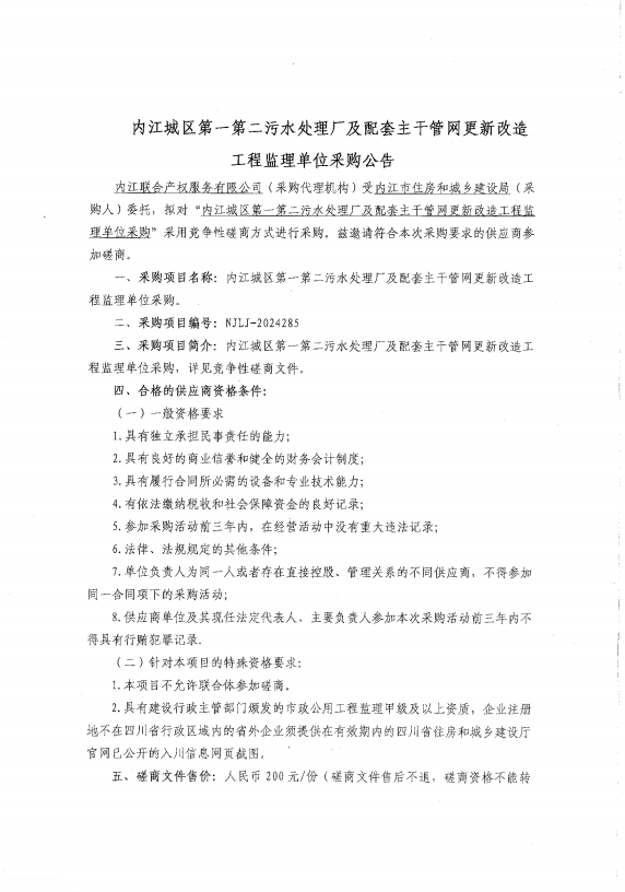 内江城区第一第二污水处理厂及配套主干管网更新改造工程监理单位采购公告