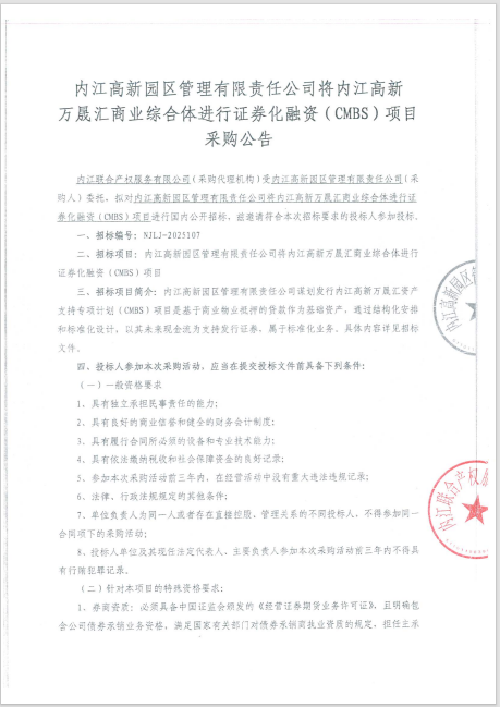内江高新园区管理有限责任公司将内江高新万晟汇商业综合体进行证券化融资(CMBS)项目采购公告