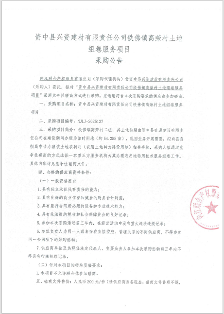资中县兴资建材有限责任公司铁佛镇高荣村土地组卷服务项目采购公告