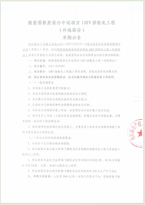 德量源新质蛋白中试项目10KV供配电工程(外线部分)采购公告