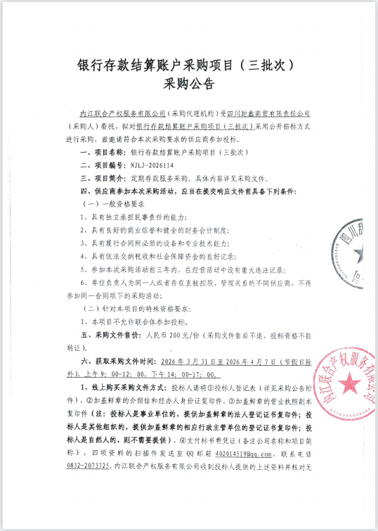 银行存款结算账户采购项目(三批次)采购公告