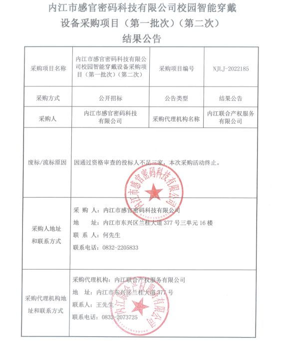 内江市感官密码科技有限公司校园智能穿戴 设备采购项目(第一批次)(第二次) 结果公告