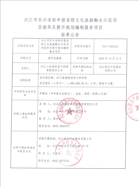 内江市东兴老街申报省级文化旅游融合示范项目指导及提升规划编制服务项目结果公告