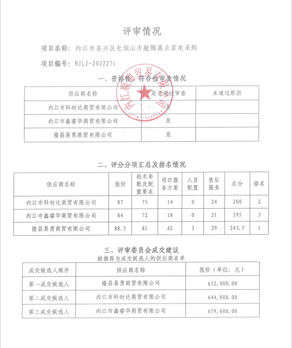 内江市东兴区长坝山方舱隔离点家具、窗帘采购结果公告