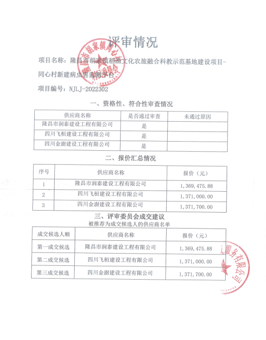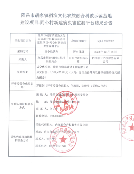 隆昌市胡家镇稻渔文化农旅融合科教示范基地建设项目-同心村新建病虫害监测平台结果公告