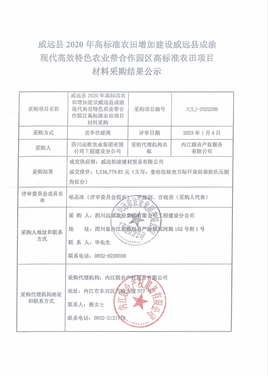威远县2020年高标准农田增加建设威远县成渝现代高效特色农业带合作园区高标准农田项目材料采购结果公示
