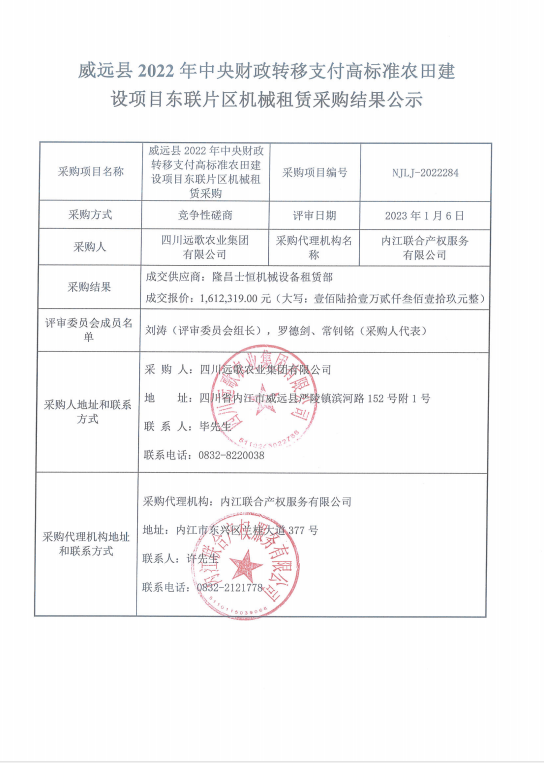 威远县2022年中央财政转移支付高标准农田建设项目东联片区机械租赁采购结果公示