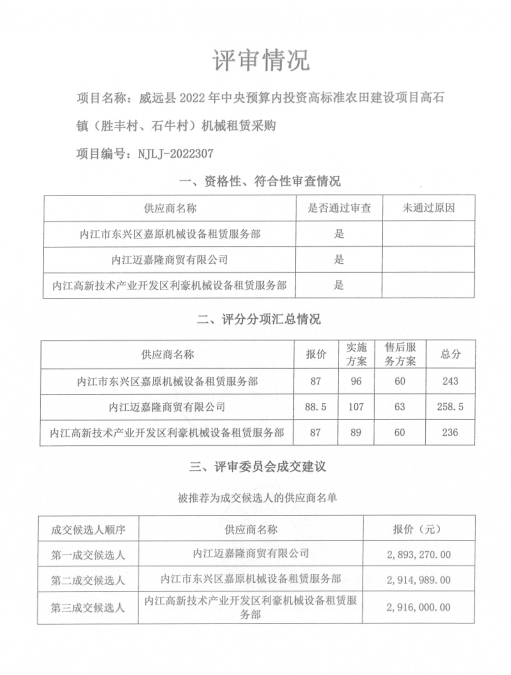 威远县2022年中央预算内投资高标准农田建设项目高石镇(胜丰村、石牛村)机械租赁采购结果公示