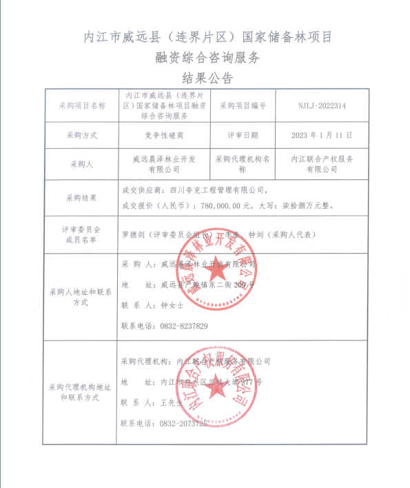 内江市威远县(连界片区)国家储备林项目融资综合咨询服务结果公告